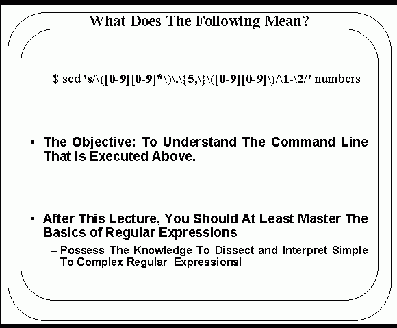 However the list isn’t all inclusive. The initial examples will primarily deal with grep(1) and awk(1). Then we’ll examine the issues of Regular Expressions as they pertain to perl(1).