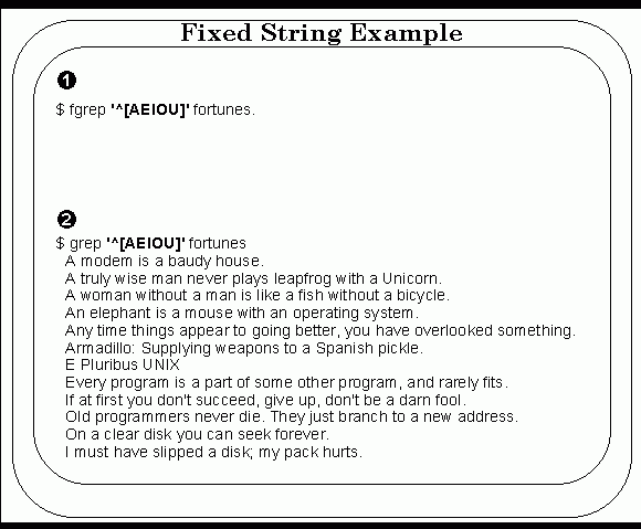 As demonstrated in the first example, fgrep(1) does exact character string matches: Notice that there were no matches since it was looking for the string “^[AEIOU]”; instead of interpreting the regular expression as being: match any line where a vowel character is the first character on the respective line. This proves the point that fgrep doesn’t support UNIX regular expressions.