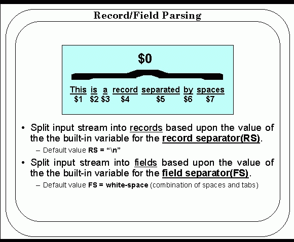 After $0 has been assigned the respective record, it will then split the record into positional parameters. By default, the field separator is white space; which can be any combination of spaces and tabs. You can assign a different value to designate the field separator. For example you can assign FS=“:” when the colon character serves as the field separator.