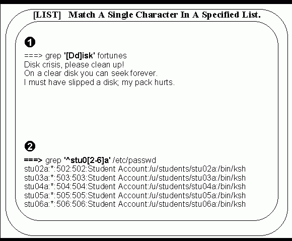 The first example, illustrates when we want to first match an uppercase or lowercase character d; immediately followed by the lowercase characters i, s, and k. This expression states to find the word disk; spelled with a lowercase or uppercase character d. Since the are no spaces surrounding this word, harddisk and diskpack could satisfy this match from the fortunes file.